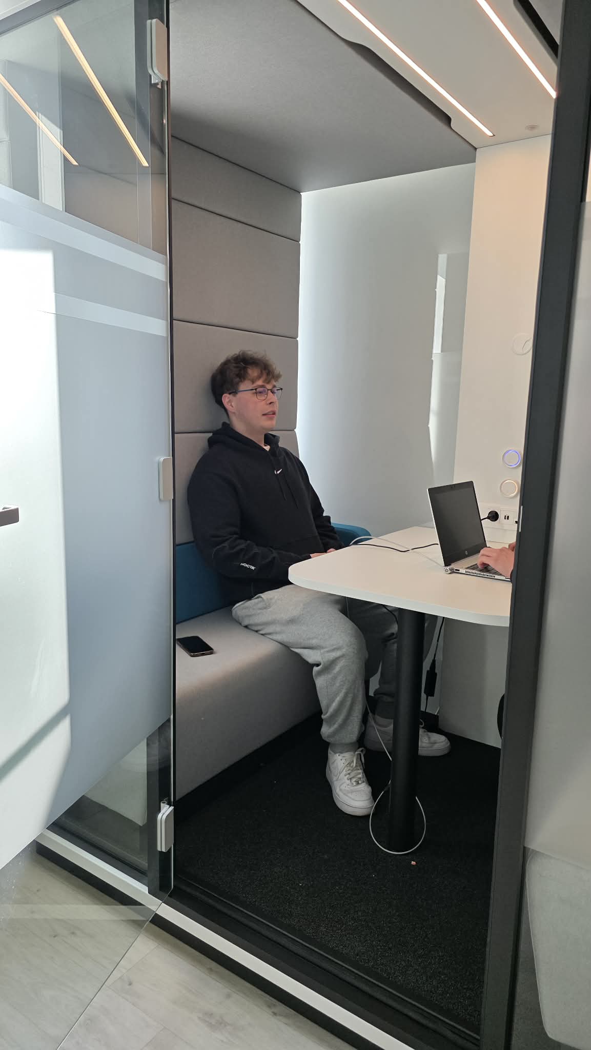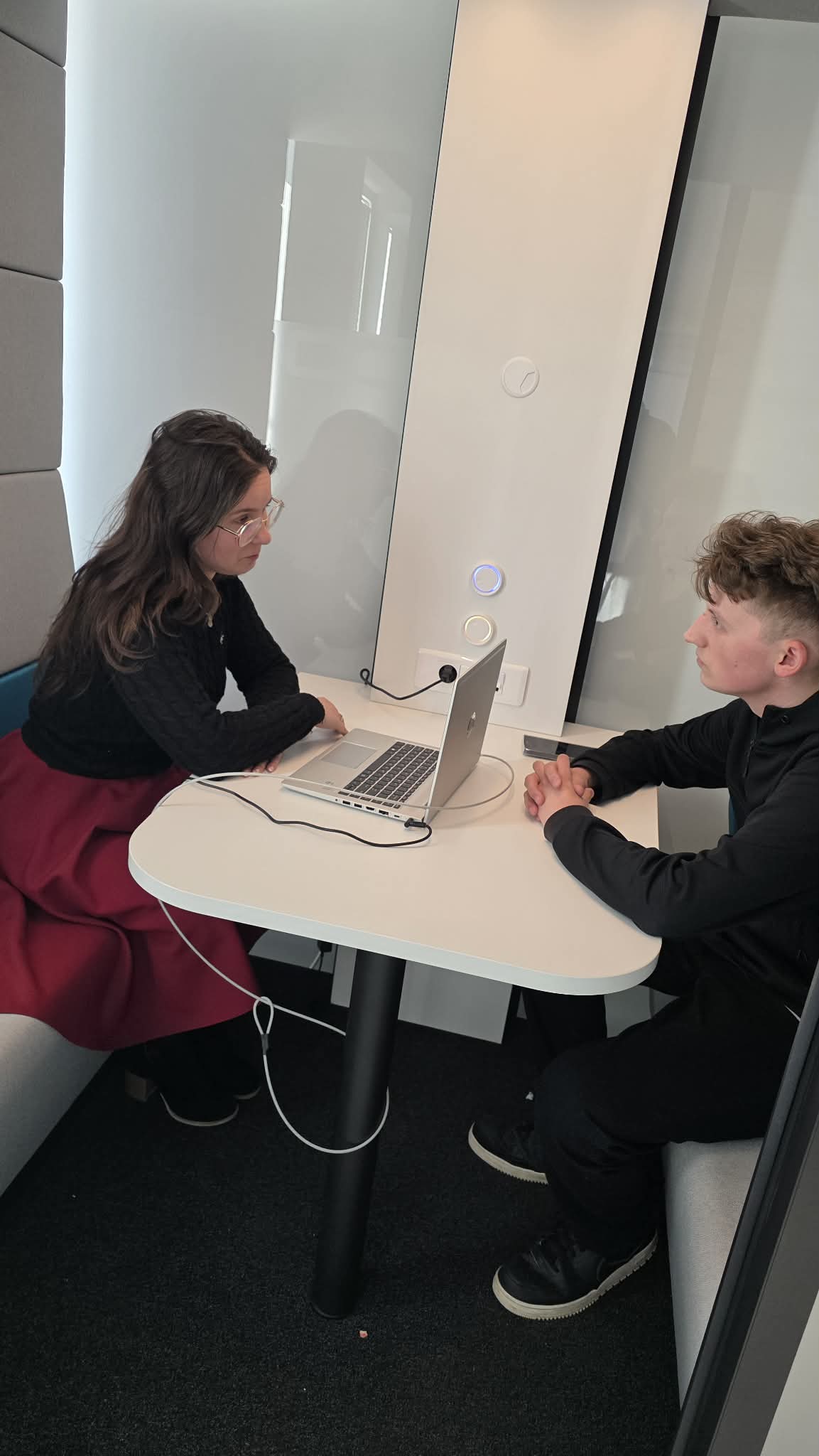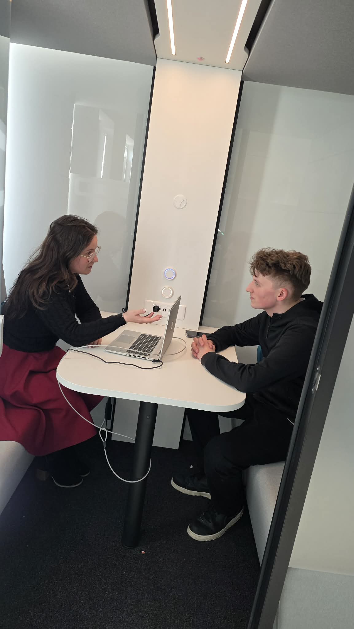 - 4 kabiny akustyczne – czyli przestrzeń wydzielona na zajęcia terapeutyczne, wyrównawcze czy korepetycje prowadzone przez psychologów, pedagogów i nauczycieli, kabina pozwala pracować bez hałasu z korytarza, bez przypadkowych podsłuchiwaczy za drzwiami.