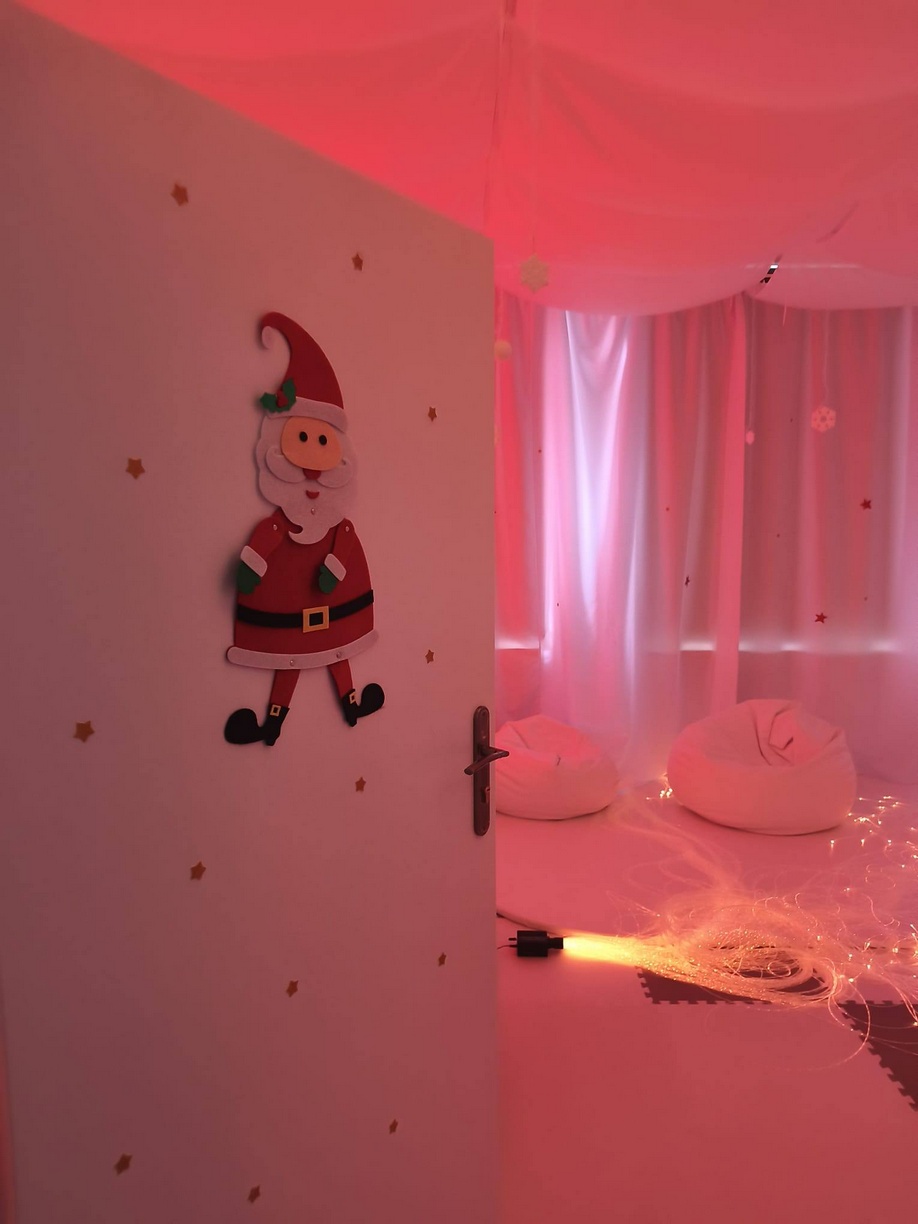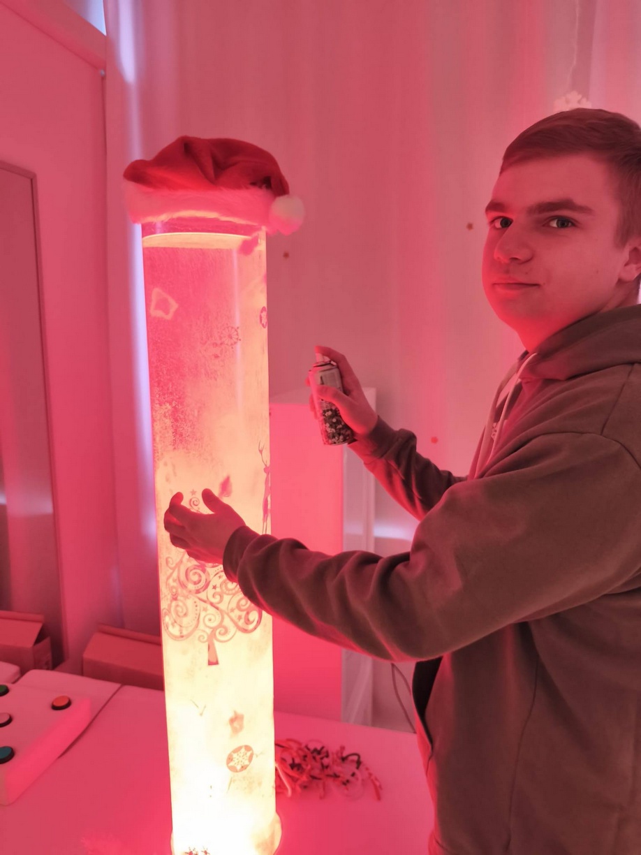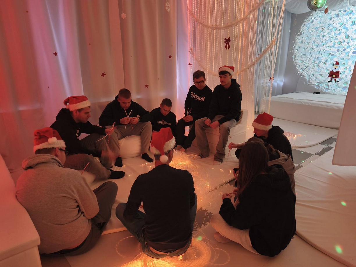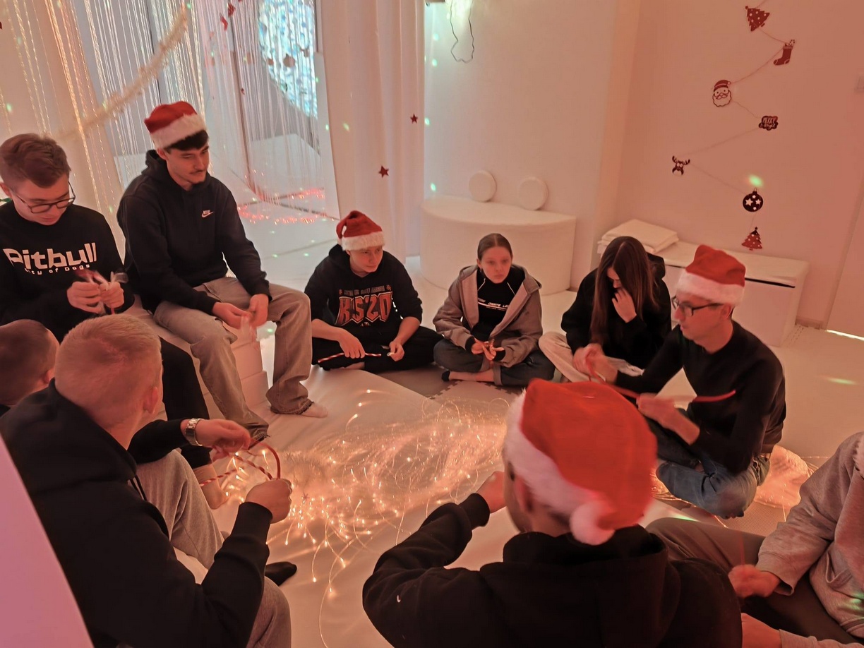 - miejscu, w którym magia łączy się z sensoryczną przygodą. Podczas tematycznych zajęć młodzież naszej szkoły mogła zanurzyć się w atmosferze zimowego nastroju dzięki wykorzystaniu świateł, dźwięków i specjalnie dobranych bodźców. Błyszczące projekcje śniegu, delikatne odgłosy zimowego lasu oraz aromat cynamonu i pomarańczy wprowadziły wszystkich w świąteczny klimat.